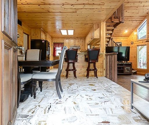 The heart of this home beats in the gourmet kitchen, adorned with granite counters and embraced by the same captivating wood walls and ceilings that unite the entire living space. Share delectable meals in the attached dining room, where every bite is accompanied by the soothing ambiance of nature just beyond the windowpane.