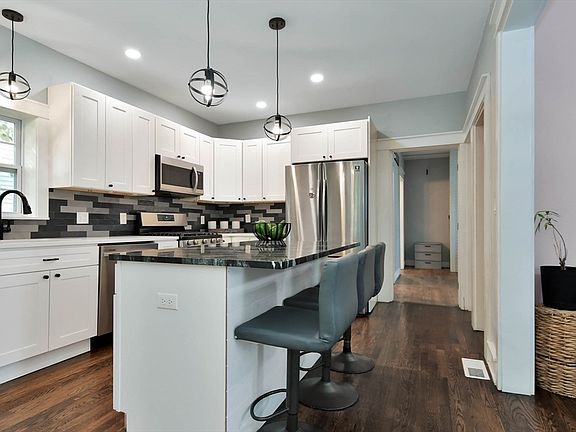 - Features: Flooring - Hardwood, Countertops - Stone/Granite/Solid, Kitchen Island, Cabinets - Upgraded, Recessed Lighting, Remodeled, Stainless Steel Appliances, Gas Stove, Lighting - Pendant