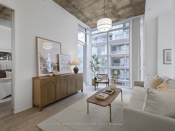 Welcome to Riverside Square, ideally located at the gateway of the Queen Street Bridge and Don Valley in Toronto's thriving East End. This modern NE corner 2-bedroom, 2-bath suite features laminate flooring throughout, an open-concept living and dining area with soaring 11 ft exposed concrete ceilings, floor-to-ceiling, wall-to-wall windows, a sleek kitchen with center island, and two open balconies. Residents enjoy extensive amenities including a rooftop infinity pool, terrace, gym, games room, party room, yoga studio, and more. Steps to trendy restaurants, cafés, shops, parks, and schools, with easy access to the Queen streetcar, DVP, and Gardiner Expressway. A vibrant community rich in history and character, Riverside is the perfect place to call home!
