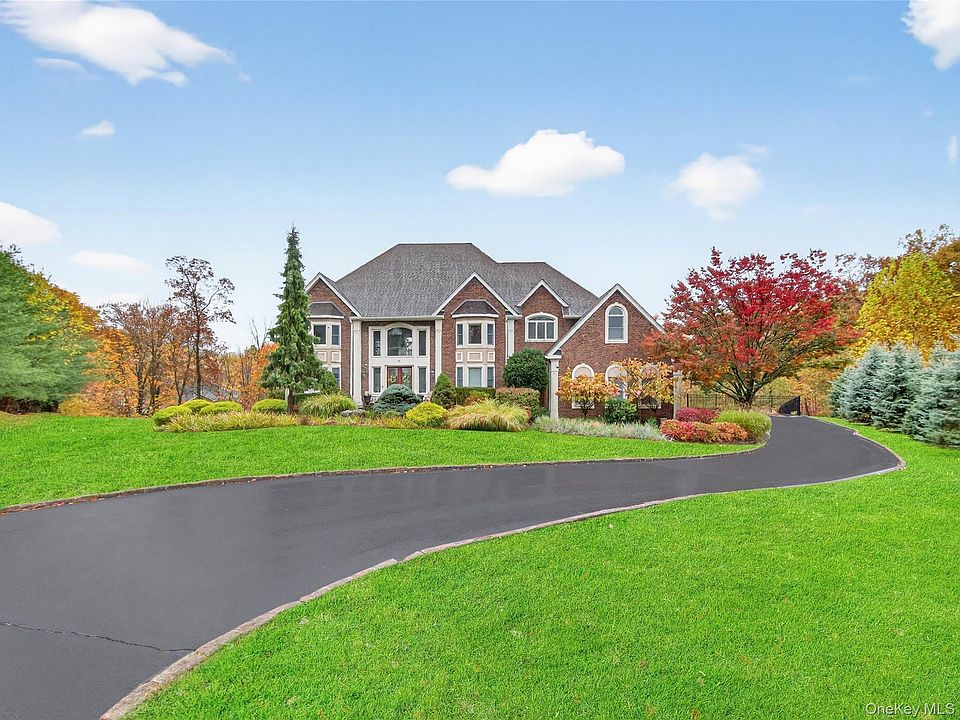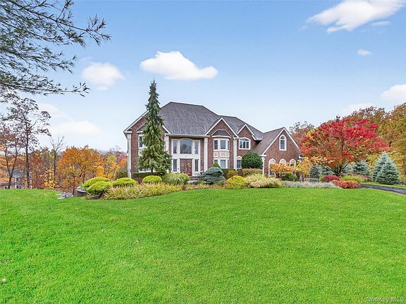 Welcome to 15 Beaver Pond Court in Stony Point — a stately ~5,000 sq ft Colonial set at the end of a private cul-de-sac with serene Hudson Valley mountain views. A grand two-story foyer with decorative columns, crown moldings, and hardwood floors introduces a light-filled plan designed for both everyday comfort and elegant entertaining. Formal living and dining rooms showcase refined millwork and elegant lighting, while the sun-splashed family room impresses with soaring ceilings and a striking stone fireplace framed by expansive windows.