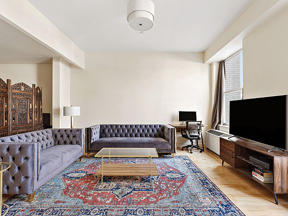 Please enquire for video tour, which includes terrace and views. THE APARTMENT: Apartment 2428 sets the standard for exceptional studio living. This thoughtfully designed space maximizes every inch, showcasing a perfect blend of functionality and style. The high ceilings create an airy atmosphere, further accentuated by the abundant natural light flooding in from the oversized window and expansive glass terrace door, offering a stunning southern exposure. Step outside to the 107 square foot private terrace, a peaceful retreat right at your doorstep. Inside, Apartment 2428 continues to impress with its smart layout. A cleverly designed wall separates the sleeping area, while creating additional nooks perfect for display or storage. The spacious yet sleek kitchen caters to both cooking enthusiasts and entertainers alike. Unwind in the large bathroom featuring a deep soaking tub, adding a touch of luxury to your daily routine. Other noteworthy features include hardwood flooring throughout and a laundry closet with washer and dryer. THE AMENITIES: 15 Broad offers a spectacular list of amenities (included with rent) which feature: 24-hr doorman and concierge; a full-scale gym with state-of-the-art equipment; lap-pool and hot-tub; yoga/dance/martial arts studio; court basketball; squash court; bowling alley; his and her locker rooms with sauna; lounge/party room; billiard and ping-pong tables; study; movie screening room; children's play room; study; and the 7th floor "Starck Park", a fully landscaped 5,000 sf. roof-park with sensational views of the NYSE; complete with reflecting pool, fireplace, dining tables, and lounge chairs, all for relaxation and entertaining. NOTES: Convenient transportation lines include: J,Z,4,5,1,2,3,R, NJ Path train Please allow a minimum of 30 days for application processing and board approval