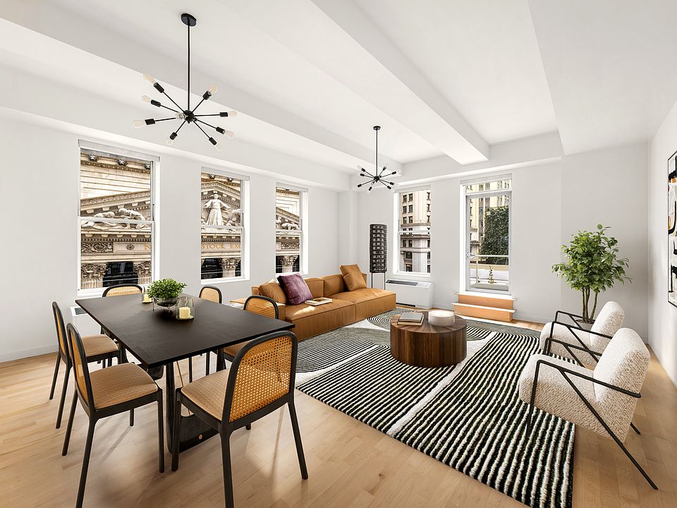 Spanning ~2,200 interior square feet with an additional 400-square-foot private terrace, the home offers soaring 12.5-foot ceilings, oversized windows, and north- and west-facing views that frame the historic New York Stock Exchange building. The loft-like great room opens directly onto the terrace, creating an effortless indoor-outdoor flow perfect for entertaining.