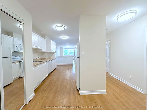 Spacious and bright, this 1-bedroom suite at The Brookbanks offers an impressive 960 sq ft of living space. The galley kitchen features crisp white cabinetry, a full set of white appliances, and a convenient breakfast bar with a large window for natural light. The open-concept living and dining area is perfect for relaxing or entertaining. The oversized primary bedroom includes wall-to-wall windows and a walk-in closet for ample storage. Enjoy the convenience of your own private ensuite laundry room with even more storage space. Ready for you to move in and make your own.This prime location offers easy access to the Don Valley Park, Highway 401, and all major public transportation routes, making your commute a breeze. Enjoy the convenience of nearby shopping with grocery stores, cafes, and restaurants. The Shops at Don Mills, renowned for some of the best shopping in Toronto, are also just a short distance away. Parking available to rent. Tenant is responsible for hydro.