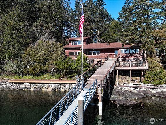 Brown Island Waterfront with a Private Dock. On the southwest side of Brown Island enjoy the long sunny days, sunrises, views of Mt Baker, SJ and Upright Channels, the harbor, ferry and boating traffic. 215 medium bank Waterfront with expansive decks offering spectacular outdoor entertaining and peaceful wildlife viewing. The 1-1/2 Story home plus lower level offers 2823 SqFt with open floor plan, 4 beds, 3 baths, den and bonus areas, sleeps 12. Spacious chefs kitchen with quality SS appliances. Primary bedroom offers beautiful harbor views and en-suite bath. Lower level has bedroom, bath, plus shop. Five minute boat ride to Town for shopping, restaurants & services. Brown Island amenities include pool, fitness area, moorage, & caretaker.