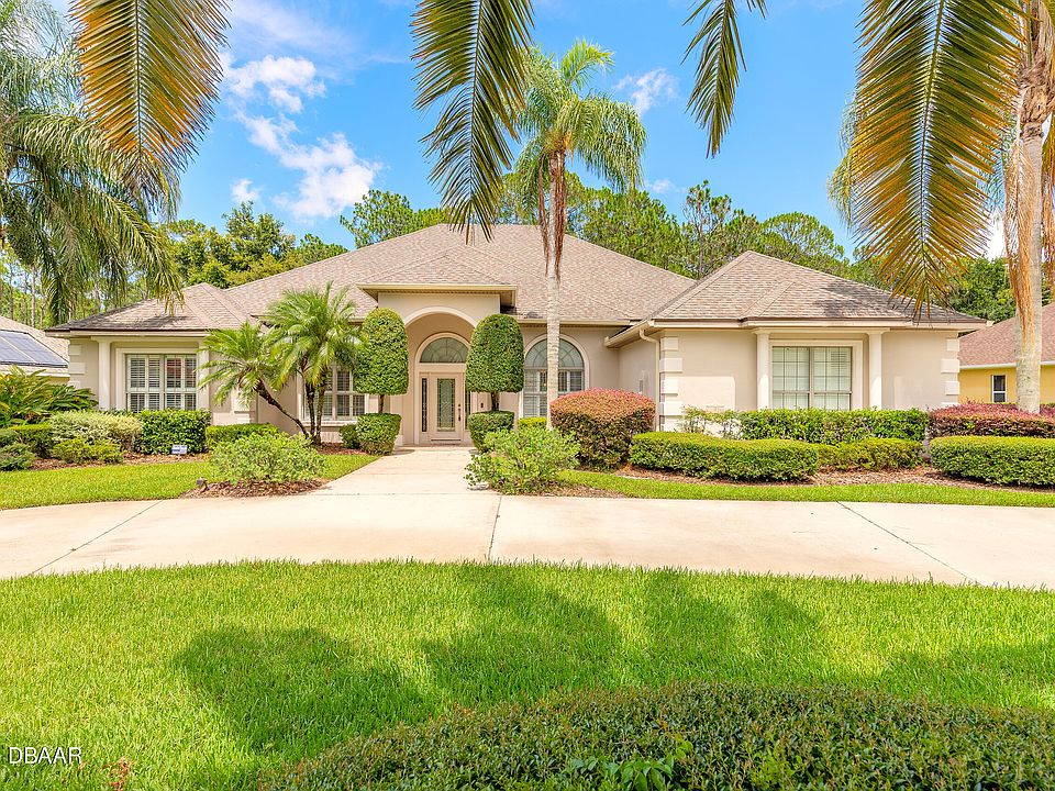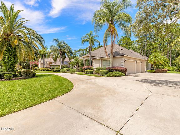 Welcome to this luxurious 4-bedroom, 3-bathroom pool home located in the prestigious Chelsford Heights estate section of Hunters Ridge. Impeccably maintained and move-in ready, this elegant residence sits on over a half-acre lot and backs up to a peaceful preserve, offering the ultimate in privacy and tranquility. A spacious circular driveway and a 3-car garage provide ample parking and a grand first impression. Step inside to discover soaring volume ceilings adorned with crown molding and timeless plantation shutters throughout, creating a refined and airy ambiance from the moment you enter. The kitchen is a showstopper, featuring gleaming granite countertops, a stylish stone tile backsplash, stainless steel appliances, and generous cabinetry; perfectly blending function and luxury. The open-concept design flows seamlessly into the living and dining areas, making it ideal for both intimate gatherings and entertaining. Retreat to the expansive master suite, complete with two walk-in closets and a spa-inspired en-suite bathroom. Each of the additional guest bedrooms is oversized, thoughtfully designed to provide both comfort and flexibility for family or visitors. Step outside and discover your own private paradisean inviting screened-in pool for year-round enjoyment and an in-ground spa offering the perfect place to unwind. Surrounded by lush landscaping and natural preserve views, the backyard delivers unmatched serenity and space. Located just minutes from top-rated schools, shopping, dining, and all that Ormond Beach has to offer, this stunning estate offers the perfect blend of luxury, location, and lifestyle. Don't miss this rare opportunity to own a slice of paradise in one of Ormond Beach's most sought-after communities! Roof 2022, HVAC 2021, hot water heater 2021. All information deemed accurate but cannot be guaranteed.
