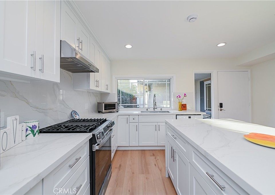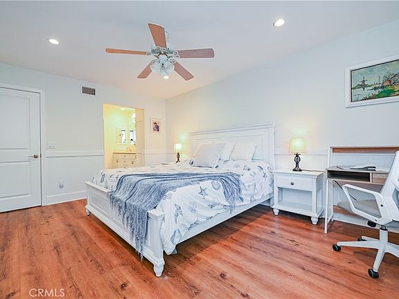 Furnished. Remodeled. 2 bedrooms,2 bathrooms downstairs and 1 bedroom +1 bathroom upstairs. This beautifully remodeled home has been meticulously maintained .Partially new flooring.Dual pane windows and patio slider. The renovated bathrooms are spectacular with custom mosaic tile, natural stone and glass countertops. The master suite features a walk-in closet with custom organizers, ceiling fan and wainscoting. The kitchen opens to the Great Room with fireplace, wet bar, soaring ceilings and an abundance of natural light from multiple sources. The entry courtyard and fenced rear yard are both private and secure. 2 car garage with private driveway, total 4 car parking spaces. The part of ceiling on hallway upstairs is low. The schools are among the best in California and shopping, dining and freeway access is nearby. The association has 2 resort style pools, spas, lighted greenbelt, BBQ and clubhouse.Close to a coming soon supermarket.