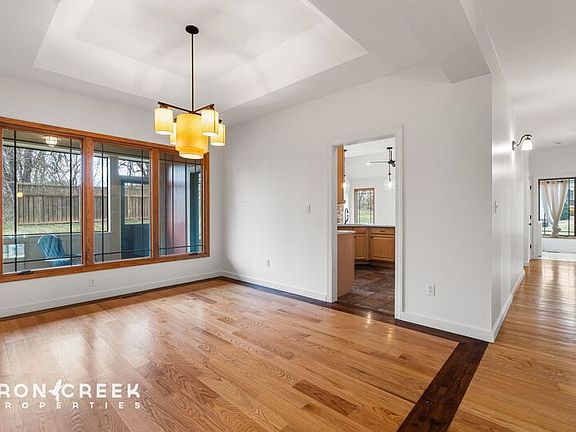 The kitchen is outfitted with stainless steel appliances including a French door refrigerator with ice maker, over-the-range microwave, electric range, and built-in dishwasher, plus a garbage disposal. Quartz countertops span the workspace and extend to the kitchen island with breakfast bar seating. Glass-front wood cabinets add character while providing display space. Large southwest-facing windows bring in plentiful natural light and evening warmth throughout the year, with views of the tree-lined backyard. Adjacent to the kitchen, a separate dining room with tray ceiling provides elegant space for meals and special occasions.