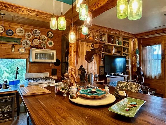 NEW ON THE MARKET: One of the most special cabins in the area. On just over an acre of gently sloping land with views of the Angel Fire Resort ski mountain. New private well. Outdoor living at its best. Decks looking out over meadows and mountains. Incredibly artistic and creative interior. Comes furnished with few exceptions. Washer and dryer, propane range with pantry. In addition to the main cabin there is a very small detached bunk room that sleeps 4 and a very cool detached shop. Neither has been added to the square footage. The circular, gently sloping driveway is easy in the winter. Year-around property. Short term rentals allowed. Fiber optic internet available. Private well. County zoning. Wildlife everywhere. Only minutes to the Village of Angel Fire and the Angel Fire Resort with its ski mountain, nationally acclaimed mountain bike terrain park, $15 mill Country Club, PGA-rated golf course, etc. Angel Fire airport with its jet capable runway for private aircraft about 10 min away. About 40 min to Taos, 10 min to Eagle Nest State Park, and about 30 min to Red River.
