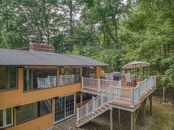 Welcome home to this cool and exciting contemporary Deck house nestled in a beautiful Bedford neighborhood! As is the hallmark of these unique homes, you will find post and beam construction, soaring ceilings, exposed beams, and huge expanses of glass to connect to the nature outside that surrounds the house. The kitchen with island is located right between the 26 x 14 living room w/ brick fireplace and the massive family room addition which has skylights and custom built-ins. The main bedroom suite offers a private bathroom plus an office that could be a nursery or an amazing walk-in closet! A favorite spot is definitely the huge deck off the rear of the home, many cups of coffee and cookouts have been enjoyed here. The lower level of the home offers 3 more bedrooms, a full and 1/2 bath, and another family room with fireplace. Efficient gas heat, many newer windows, and rear roof replaced 2019. Enjoy the beauty of this home and neighborhood yet moments to every amenity!