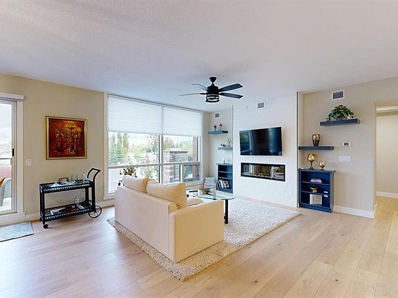 *** OPEN HOUSE - SUNDAY - NOVEMBER 16 from 2 to 4pm - CHECK OUR OUR NEW PRICE!*** Welcome to UBER luxury living at The Views, where this top-floor 3-bedroom home offers a blend of modern style and timeless design. Constructed with concrete and steel, this very unique state-of-the-art building is a testament to enduring quality and excellent workmanship. Step inside this picturesque building and immerse yourself in the inviting ambiance of illuminated floor-to-ceiling windows that immerse the space in natural light. This open concept integrates the living, dining, and kitchen areas, promoting an ideal environment for entertaining with friends and family. The kitchen is a culinary delight, that includes a spacious island, large quartz countertops, and top-of-the-line LUXURY Wolf appliances, including an induction stove top with the option to switch to gas, a built-in microwave, dishwasher, wall oven, and LUXURY subzero fridge. There is extra storage with the sizable walk-in pantry. In the living room there is a cozy electric fireplace for those cold Calgary's months, while a large entertaining WARM SOUTH FACING patio beckons with a convenient gas line for barbecues. In fact, the SOUTH FACING patio is one of the largest in the building with two separate areas. Enjoy the view of the Mountains and the Bow Valley from these two patios! A conveniently located 2-piece bathroom caters to friends and family with ease. Consider the juxtaposition with one side of this home having a luxurious owner's retreat, featuring a private sitting area, a balcony with mountain views, expansive walk-in closet, and an illuminating 5-piece ensuite. On the opposite side, two more spacious bedrooms, each with walk-in closets, are complemented by a Jack and Jill shared 4-piece bathroom and a convenient laundry room equipped with a sink and ample storage. An additional room serves as the perfect home office. This home also includes two side-by-side titled parking stalls, a storage (44) locker, and an extra storage bin for added convenience. This award-winning building offers amenities such as a heated driveway leading to the parkade, a gym with an amazing golf simulator and a sauna, a very secure bike room, there are lounges on every floor, an owner's lounge, and a two-level outdoor terrace with a sweeping panoramic view of the river and the city. Owners can enjoy the BBQ area, an outdoor fireplace with lounge seating, and quick access to the city pathways for secluded strolls and bicycle rides. The Views is situated near parks, walking paths, schools, public transportation, and surrounded by an environmental reserve. This residence epitomizes uber LUXURY urban living at its best!