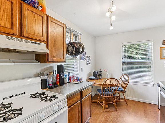 Two bedroomsGas rangeLarge bay windowEat-in kitchenShaded paver patioCozy dining nookOverlooking green space