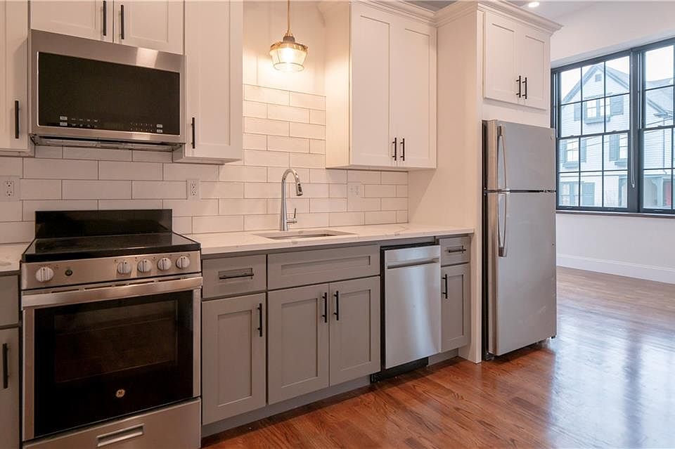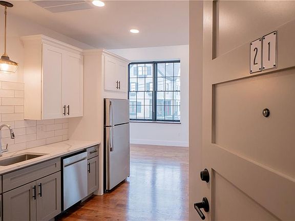 Available January 1st at the Calvert! This former elementary school has been fully renovated into modern apartments while keeping the charm of the schoolhouse. Units feature open floorplans, soaring ceilings, large windows, new kitchens with quartz countertops and soft shut cabinets, and central air. The building features basement storage and laundry, one assigned parking spot per unit plus ample guest parking. Tenants are responsible for electric, cable and wifi; hot water, water/sewer, trash and snow removal are included. No pets please. This corner unit is located on the first floor, and has two bedrooms and one and a half bath. This unit features a grand window in the living room, flooding the unit with natural light all day.