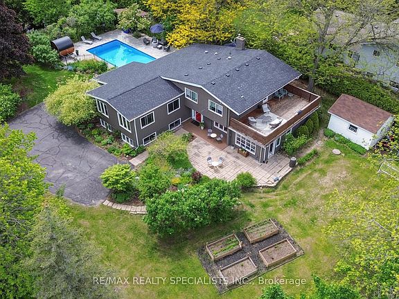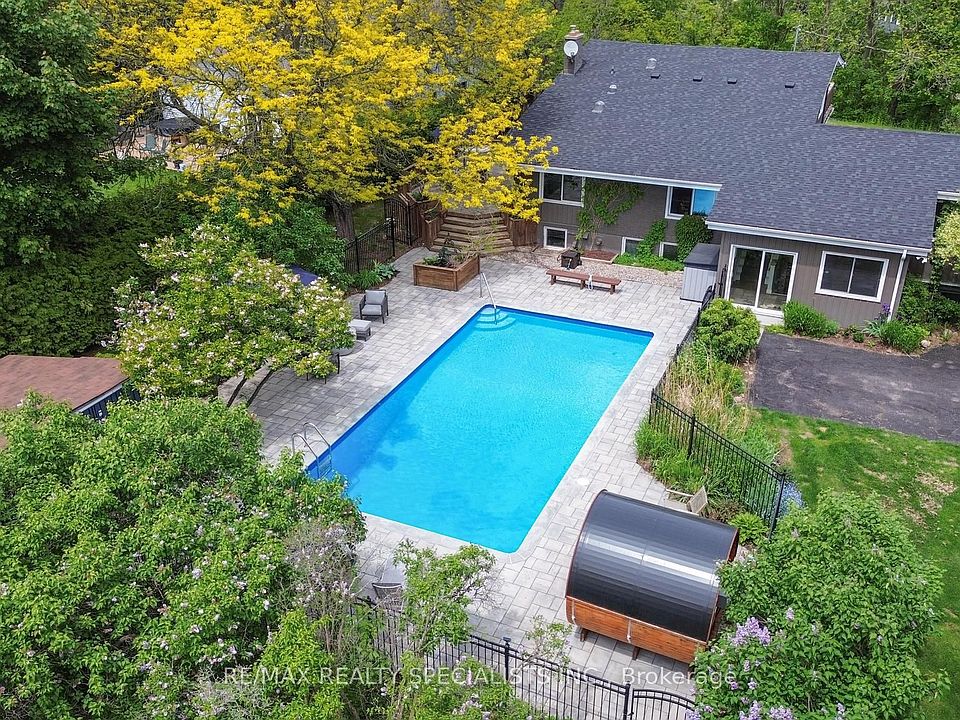 Tucked away in the lush, storybook setting of Glen Williams, this extraordinary property sits quietly along the scenic banks of the Credit River, offering nearly an acre of private paradise. With over 3,600 square feet of thoughtfully designed living space, it blends timeless charm with modern convenience, creating a home that feels both warm and inspiring. From the moment you arrive, the sense of privacy and tranquility is unmistakable. The expansive backyard is a true sanctuary - imagine summer days spent in the 36-foot saltwater pool, unwinding in the rustic barrel sauna, or entertaining on manicured grounds framed by mature trees and vibrant gardens alive with birdsong. It's a retreat designed for both lively gatherings and quiet reflection. Inside, a bright, California-style open-concept layout offers versatility for multi-generational living, remote work, or cozy moments spent by the gas fireplace. The lower level, just a few steps down, is filled with natural light from oversized windows and can adapt to almost any lifestyle need. Fine finishes and upgrades throughout include hardwood floors, upgraded lighting, an upgraded kitchen with granite countertops, backsplash, gas stove with downdraft vent and custom cabinetry. Additional features elevate daily living: a mudroom, a 17' x 12' workshop with electricity, water, and heat prep, plus a 12' x 8' storage shed. Recent improvements bring peace of mind, including a renovated main bath (2024), new AC/heat pump (2024), upgraded electrical panel (2023), new roof (2025), and updates to the saltwater pool (2023 & 2025). A full-lot invisible pet fence (2021) completes the package. A rare find in the heart of a friendly, tight-knit community where nature, comfort, and style come together in perfect harmony.