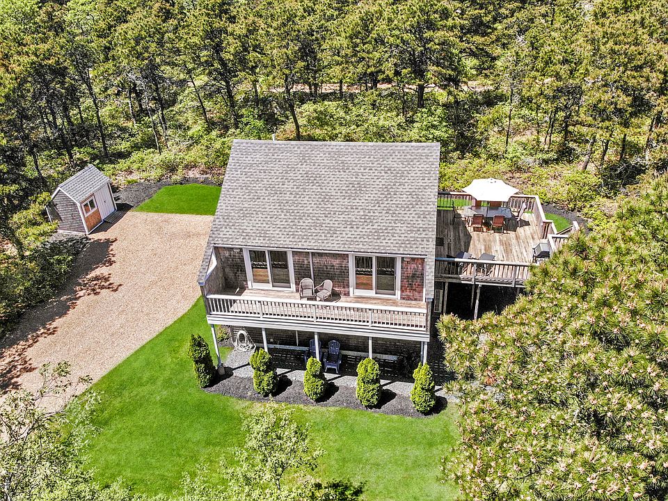 Contemporary reverse-style home in Edgartown Estates - the perfect vacation getaway! The main level offers loads of natural light and a terrific open floor plan that seamlessly flows to the outside. The living and dining area offers sliding glass doors that open the front deck, and off the kitchen is a larger deck for relaxing, dining and grilling. On the first floor are three bedrooms and a full bath with laundry. There is a full basement for storage or future finished space and a shed for all your bikes and beach gear. The home is owner-occupied seasonally and has been well maintained and updated in recent years with mini splits for cooling and heating, new interior trim and doors, hardwood floors, kitchen renovation, and more. This is an excellent location within Edgartown Estates, just off the bike path to South Beach and into the Village. The nicely wooded lot provides privacy and screening from neighbors and the road. Being sold turnkey - come take a look!
