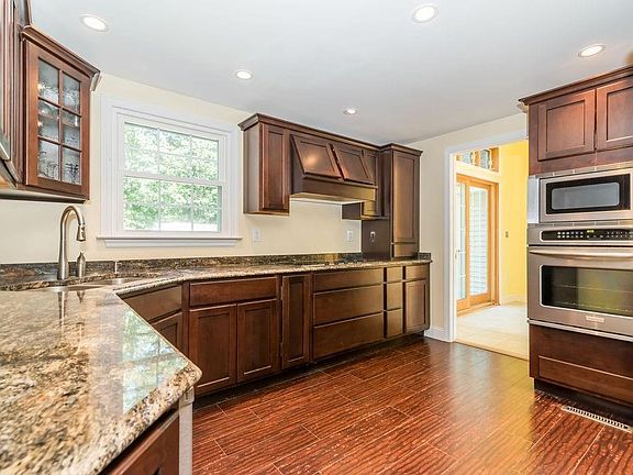 A spectacular updated Gambrel located in a desirable cul-de-sac neighborhood on a ½ acre, surrounded by mature trees & accented w/ an oversized 2 Car Garage w/ stunning addition! A glass slider allows for sunlight to greet you as you enter in the foyer, leading to the backyard boasting a fenced-in Shed & a 32'x16' Inground Pool w/ 3 year young liner, infinity stairs & more! Kitchen is lined in Kraftmaid 100% Cherry Cabinets w/ granite countertops & Frigidaire Professional Series appliances. Knotty Pine floors & a Brick FP in the LR are joined by an accent beam opening to an addt'l space, so you can relax or be ready to entertain in ease! Rounding out the main level is a Full BA & a Formal DR w/ French Doors. Upstairs find 3 BDRMS & a Full BA w/ luxury tile & updated fixtures. Addt'l features include a finished BSMNT wrapped in white wainscotting w/ a brick accent wall along with custom easy closets in BA's & BDRMS.