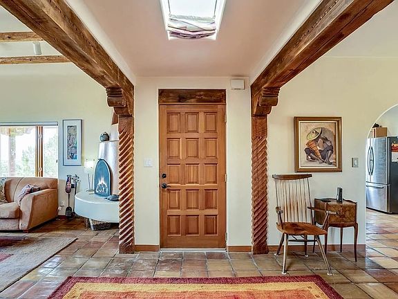 Escape to serene living in this charming, unfurnished 3-bedroom, 2-bath home in the picturesque community of El Dorado. This inviting residence features beautiful tile floors in the kitchen and living room, complemented by cozy carpet in the bedrooms. Experience the warmth of traditional wood viga ceilings and a fireplace in the spacious living room, perfect for chilly evenings.