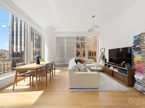 This 1,033-square-foot one-bedroom, one-bath home welcomes you with an elegant entry foyer that flows into a sunlit living and dining area framed by 10-foot windows with south and west exposures. The custom kitchen by Gachot features rift-cut cabinetry, a Calacatta Borghini marble waterfall island and backsplash, and premium Gaggenau appliances—including a cooktop, combi-steam oven, double convection ovens, refrigerator, and wine cooler. Throughout the residence are 5-inch white oak plank floors and striking 9-foot solid walnut doors.
