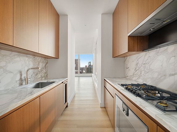 The sleek kitchen features Gachot-designed custom rift-cut cabinetry, complemented by honed Calacatta Borghini marble countertops and backsplash, and top-of-the-line Gaggenau appliances, such as a cooktop, combi-steam oven, convection double oven, refrigerator, and wine refrigerator, that are thoughtfully integrated into the kitchen.