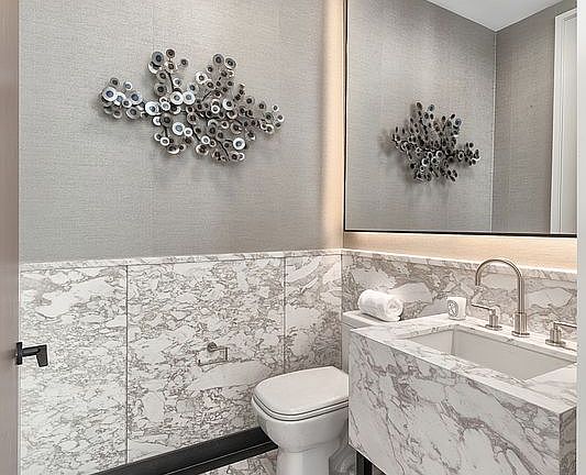 A private vestibule with a gracious walk-in-closet separates the living area from the primary bedroom suite, creating a sense of privacy. The en suite master bath offers honed Bianco Dolomiti marble on the walls as well as floors, which are heated, with a custom Gachot-designed vanity and mirror. Platinum matte Dornbracht fixtures accentuate the vanity, Kaldewei tubs and Durivit toilet. A striking powder room with honed Calacatta Nuevo and Absolute black marble walls complemented by a Gachot-designed custom vanity with Dornbracht fixtures is situated thoughtfully off the entry foyer.