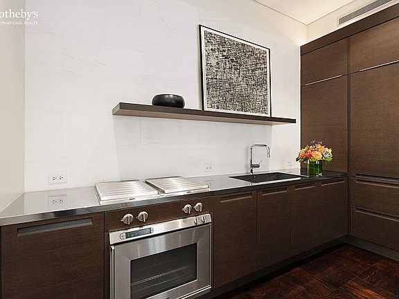 The spacious Bedroom easily accommodates a king-size bed and features two large, double-height closets and an oversized window with remote-controlled blackout shades and drapes. The luxurious, windowed marble Bathroom is outfitted with high-end European fixtures, a glass-enclosed rain shower, and a Geberit wall-mounted commode.