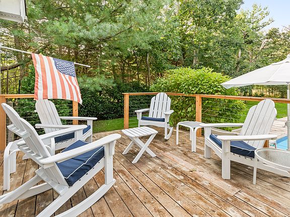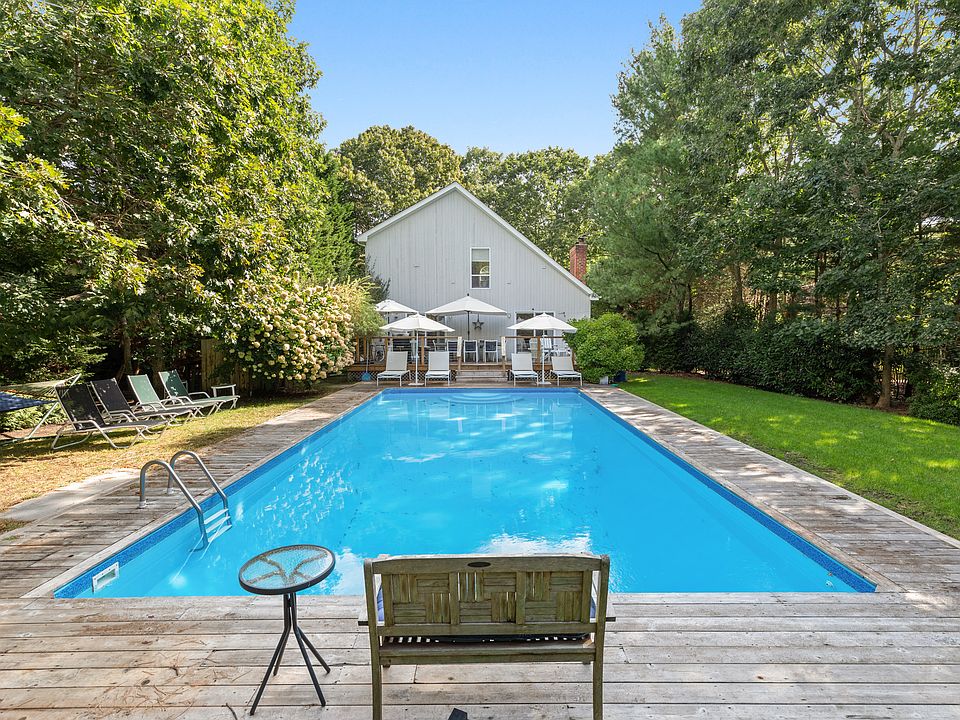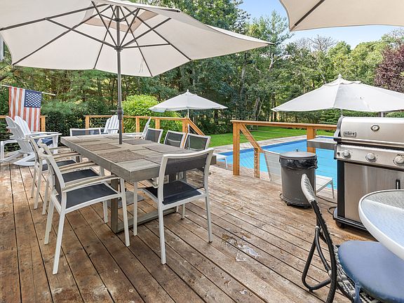 Rental Registration #: 24 - 606 Enter a lovely home, enjoy the flow throughout with Powder Room by entry, wonderful, sunny kitchen, countertop Island with bar close to dining room table. Living room tastefully designed with skylights, brick Fireplace. Sliders lead out to deck with room to sit, sun and entertain with Weber grill. Spacious backyard with pool, pool house and shower. One Master Bedroom on First Floor with fresh ensuite bath, Jacuzzi tub and large shower with double sink vanity. Second Floor sun- filled Master Bedroom with ensuite Bath and Guest Bedroom with ensuite Bath. Lovely touches with TV in each room. Lower level/Finished Basement houses Washer/Dryer. Large Screen TV, Pool Table, Room for Exercise with Ecliptic/Treadmill, Couches and Chairs for relaxation. This is a perfect location to enjoy all the summer has to offer with beach, fresh fruits and veggies two miles and three minutes away. Near Jitney, Shops and Restaurants.