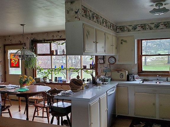 Open interior with large window lighting 1.10 acres with VT southern view 48 x 26 garage, previously used as machine shop Partially finished basement, plumbing for bathroom