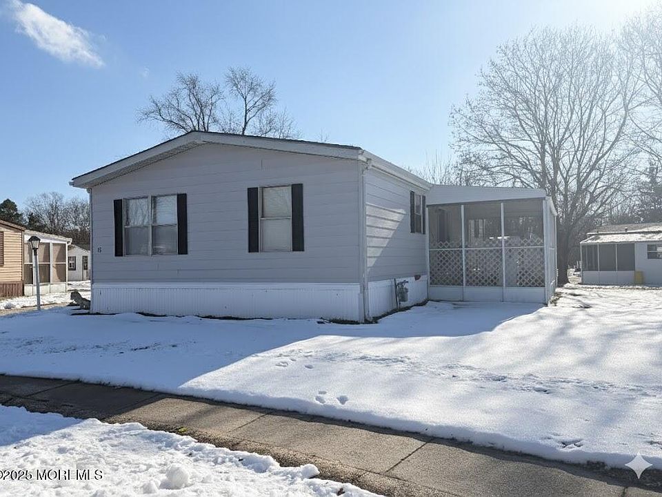 This double-wide mobile home in the 55+ adult community of Jackson Acres offers 2 bedrooms and 2 full bathrooms. The home features off-street parking for two cars, an exterior storage shed, and two dining areas, including an eat-in kitchen with sliders leading into an enclosed sun porch. Major updates include a roof reshingled in 2015, water heater (2017), upgraded electrical panel (2023), and dual heating systems which include an electric heat pump with central air and a newer natural gas furnace (2023). Residents enjoy access to the community clubhouse and inground pool. Monthly HOA fees include lot rent, taxes, water, sewer, and trash removal—covering nearly everything you need for truly stress-free, low-maintenance living.
