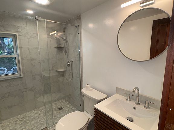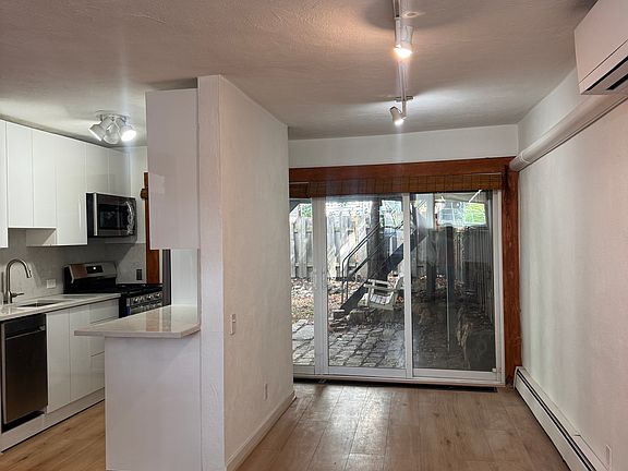This apartment features a private walk out patio, a rare find in the city. Inside, you'll find a bright, airy layout with a modern kitchen featuring brand new stainless steel appliances, quartz countertops, and a breakfast bar. The brand-new bathroom has an oversized glass-enclosed walk-in shower and new fixtures.