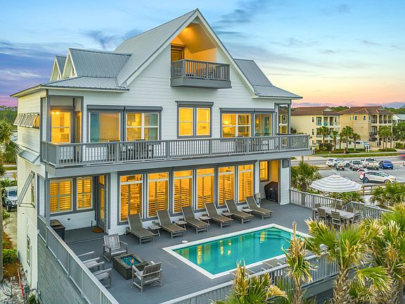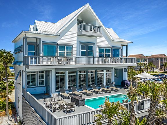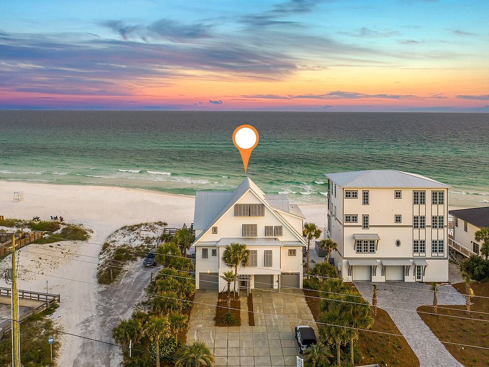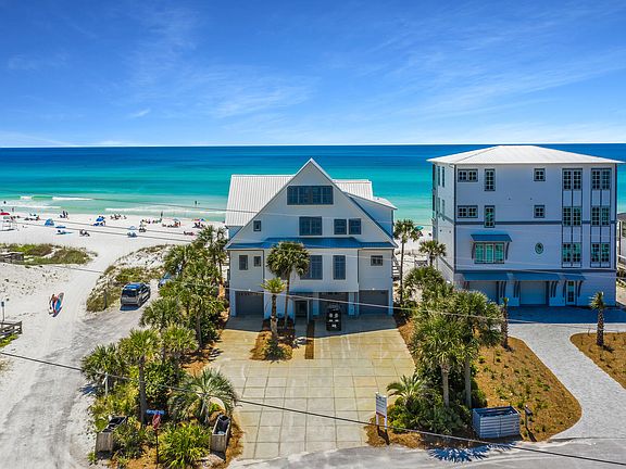 Perfectly positioned along the white sandy beaches of 30A, this exquisite Gulf view home is designed to impress the discerning buyer. Enjoy sweeping views of the water from multiple floors. The thoughtful design concept incorporates 4 of the 5 bedrooms on the gulf front side of the home with exceptional views. The spacious private pool and deck harmonize with the main living area to create a seamless flow from interior to exterior living. The well appointed kitchen includes gorgeous countertops, tiled backsplash, 6 burner gas cooktop, ice maker, and a walk-in pantry. An open floor plan concept blends the kitchen with the living and dining areas. . The entry level of the home boasts 3 garage bays and a full bath. In addition to the garage space you will find a plethora of additional parking with the extended driveways. Moving in to the 2nd floor is where you find the living/dining/kitchen previously described as well as a Gulf front bedroom, full bath, and laundry. The 3rd story contains 3 bedrooms, including the spacious Master Suite with it's tongue and groove vaulted ceilings, massive Gulf views, renovated Master Bath with soaking tub and tiled shower, and multitude of closets/storage. The 4th floor is where you'll find the bunk room with an efficient use of space leading to an exterior porch with the most grand views in the home! The home is prominently positioned on the West end of 30A adjacent to the Fort Panic beach access, preserving the land to East. Enjoy lunch or dinner at Stinky's Fish Camp just across the street or live music after the sun goes down at Stinky's Bait Shack. The West end of 30A provides a more laid back vibe than some of the more crowded 30A communities and is very close to shopping opportunities at Grand Boulevard as well as outdoor adventuring at Topsail Hill State Park.