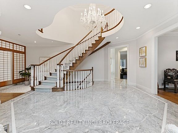 Exquisite Executive Home in Prestigious St. George's Point! Nestled in one of St. Catharines' most desirable & upscale neighbourhoods, this exceptional solid brick 2 storey with views to Martindale Pond, offers 4200 sqft of luxurious finished living space above grade. St. George's Point is known for its natural beauty, privacy & architectural character, ideal for those who value quality craftsmanship & tranquility while remaining close to city conveniences. A grand foyer with a serene Zen Garden & floating staircase sets the tone for the refined interior, featuring pristine marble, solid oak doors, oak hardwood floors, plaster crown molding & elegant Kohler fixtures throughout. The main level includes a formal LR & DR with Shoji screens, a spacious family room w/wood-burning FP, a home office w/waiting area, 2pce powder room & laundry w/sink & storage. The impressive eat-in kitchen boasts built-in appliances, an abundance of cherrywood cabinetry, a centre island w/breakfast bar & bright dining area with patio doors leading to a wood deck & fully fenced yard equipped with gas line for BBQ or fireplace. Upstairs, a curved walkway overlooks the main floor & leads to four spacious bedrms. Two share ensuite privileges to a 4pce bath; another offers a private ensuite & walk-in closet. The stunning primary suite features double oak drs, sitting area, a generous walk-in closet w/built-ins & a luxurious 6pce ensuite with jacuzzi tub, walk-in shower, double sinks, bidet & gleaming marble. The partially finished lower level offers in-law potential with a separate entrance, rough-in for kitchen, framed & insulated rooms, a 3pce bath, hot tub with ceramic surround, cold storage and abundant space for future finishing. Additional highlights include 200-amp electrical, newer furnace & hot water heater (2021). Attached triple-car garage w/inside entry & private interlock driveway with parking for 5 cars. Pride of ownership shines throughout this magnificent home-truly a must-see!