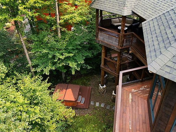 As you enter this gorgeous cabin, you're greeted by a beautiful open-concept living area, elegantly decorated with rustic stone and wooden details. The gourmet kitchen opens into the dining area, providing a space to cook and savor delicious dishes before relaxing in the living room. Sunlight bursts through large picture windows, enhancing the luxurious setting under high ceilings. Recharge in the five comfortable bedrooms, each boasting high-end comforts. Step out on the deck to catch a breath of fresh air, pamper yourself in the luxurious hot tub, or enjoy a fun movie night in the lower-level game room.
