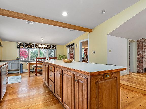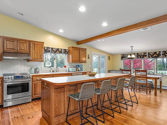 As you step inside, you'll be greeted by an open-concept main level that effortlessly combines classic elegance with contemporary living. The living room boasts a cozy wood stove, newly installed wide pine flooring which provide warmth and ambiance. The family room is perfect for relaxation and entertainment. The primary suite on the first floor is a true retreat, complete with an oversized master bathroom featuring radiant floor heating, a double vanity sink, and a beautifully tiled walk-in shower. Ample closet space ensures your belongings are neatly organized. A half bath with a convenient laundry area is also located on the main floor. There are two additional bedrooms on the second level, each with its own en suite bathroom, offering privacy and comfort for family and guests. The kitchen is a chef's delight, with recessed lighting, a large center island, and access to an oversized deck – ideal for outdoor dining and enjoying the picturesque surroundings. The great room has loads of natural light, has two floors with wide pine flooring throughout. The space is perfect for a home office, craft / entertaining. The location of 15 Hobbs Rd is truly exceptional. Situated in North Hampton, you'll enjoy a peaceful and idyllic setting while still being conveniently close to town amenities, restaurants, and the beautiful beaches. Whether you're looking for a relaxing day by the ocean or a night out on the town, this property offers the best of both worlds. Close to all routes.