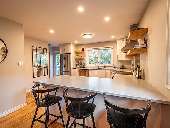 Modern kitchenOpen concept main floorStainless steel appliancesLovely dining roomModern bathroomHardwood floorsRec-room with bar area