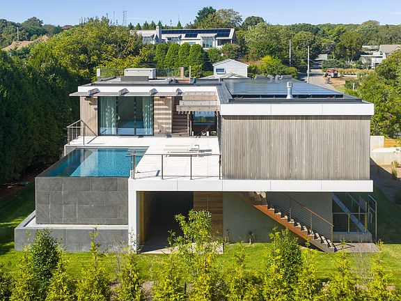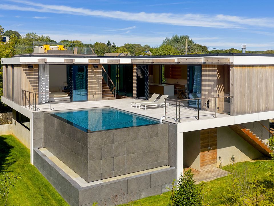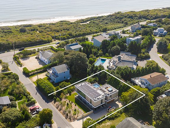 Completed in the spring of 2025, this brand-new modern residence, designed by acclaimed architect John Berg and built by White Oak Builders, offers 3,500 square feet of elegant living space across three levels. Perfectly situated less than a block from the ocean with deeded Hither Hills beach rights, the property provides direct access to Montauk's pristine shoreline while being just minutes from the town's restaurants, shops, and vibrant social scene. Thoughtfully designed for both entertaining and everyday living, the home features four spacious ensuite bedrooms and two additional powder rooms, ensuring comfort and privacy for owner and guests alike. The first floor hosts two guest suites with Duravit fixtures alongside a powder room to accommodate visitors with ease. The second floor unfolds into a dramatic open living and dining area, anchored by a custom chef's kitchen with Wolf, SubZero, and Miele appliances, a wine fridge, ice maker, and a striking stone center island. The seamless flow between these spaces makes entertaining effortless and expansive, while the primary suite on this level offers a spa-like bathroom with heated floors, and private access to the pool terrace—an ideal private retreat after gatherings. The light-filled lower level, with soaring 9'3†ceilings, is designed as a versatile extension of the home, perfect for a recreation or fitness area, an additional living room, or guest accommodations with its own ensuite bedroom and full bath. Throughout, floor-to-ceiling lift-and-slide windows dissolve the boundaries between indoors and out, creating seamless transitions and filling the home with natural light. Details such as large-format 40 x 40 stone flooring, Ceppo di Gre stone surfaces in all en-suite bathrooms, plaster walls throughout, and Watermark fixtures elevate the design, while modern conveniences like Sonos audio with invisible speakers and pre-wiring for flat screens ensure the home is fully equipped for today's lifestyle. Outdoors, this residence transforms into a private resort setting built for entertaining guests. A dramatic 20' x 13' infinity-edge gunite pool with a waterfall feature is set high on the second story, complemented by nearly 1,000 square feet of outdoor space make it a tough decision to spend your time on the beach or poolside soaking in the sun which perfectly hits the home throughout the day. A rooftop mahogany deck with a custom firepit provides panoramic ocean views, idealy for sunset or morning coffee, while a Bullfrog hot tub and a private outdoor shower embody Montauk's coastal lifestyle. From intimate gatherings to poolside parties, this home is thoughtfully crafted to make every occasion extraordinary. Professional landscaping, an irrigation system, and a two-car garage complete the property, while eco-conscious features, including a solar photovoltaic array combined with a six-zone geothermal HVAC system ensure exceptional energy efficiency. Blending luxury, sustainability, and design excellence with a layout tailored for entertainment and guest hospitality, this extraordinary home represents a rare opportunity to own a modern architectural masterpiece in Montauk.