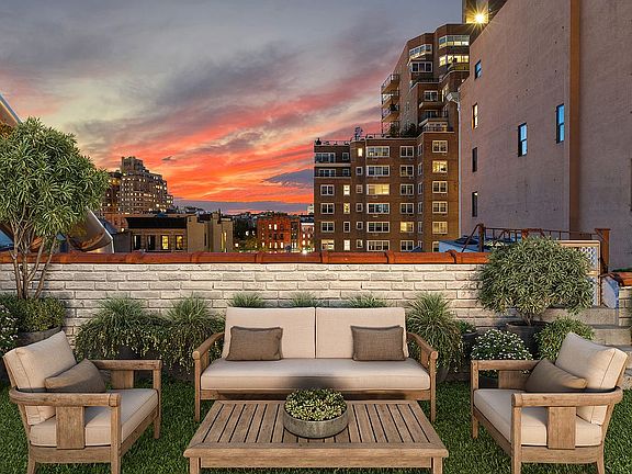 The real magic unfolds on the west-facing terrace, a sanctuary bathed in golden light, offering a serene escape from the city’s pulse. This outdoor haven invites quiet moments or intimate gatherings amidst lush greenery, seamlessly extending the living space, kitchen and dining area that offers an abundance of windows and two skylights. A limewashed brick wall on the top floor adds texture and warmth, enhancing the home’s character with a nod to rustic sophistication.