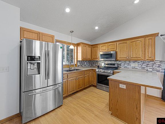 Prepared to be wowed by this Upper North Mankato with oversized pie shaped lot on cul-de-sac. Front opens to main floor providing kitchen and dining area with picture window, coat closet and access to finished garage. Heading upstairs is a lofted living room with access to deck featuring a grill bump out and stairs to oversized yard. Upstairs is finished with a full bathroom and two bedrooms, both with plenty of sunlight. Lower level provides two more bedrooms, one being oversized enough for use as a TV room or gathering space. A second full bathroom, this one with a jetted tub and custom tile. Updated washer and dryer housed in the utility room complete the lower level. Yard provides a variety of trees and bushes as well as a large kennel on cement attached to the side of the garage. Come and see for yourself!
