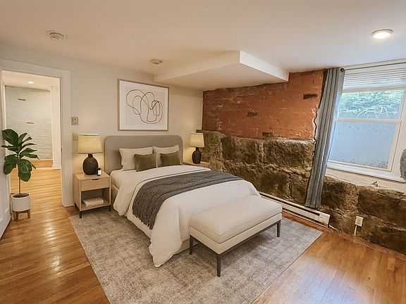 Exposed stoneOpen layoutHardwood floorsBay windowsGood height ceilings
