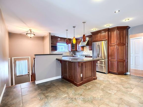 Excellent Opportunity For A Big Family To Rent 3 Bedr Raised Bungalow And Finished Basement On A Quiet Street. Great Functional Layout, 3 Bedrooms, Dining - Living Separate Rooms, Upgraded Kitchen With Island Granite Countertop, Backsplash, Pot Lights, Renovated Washrooms, Hardwood On Main Floor. Side Entrance To Finished Basement With Kitchen, Bedroom, 3Pc Washroom can be used as in lawsuit, Huge Recreation Room With Gas Fireplace, Large Laundry, A Lot Of Storage Space. The tenants are responsible for all the utilities, hot water heater, lawn care and shelving the snow