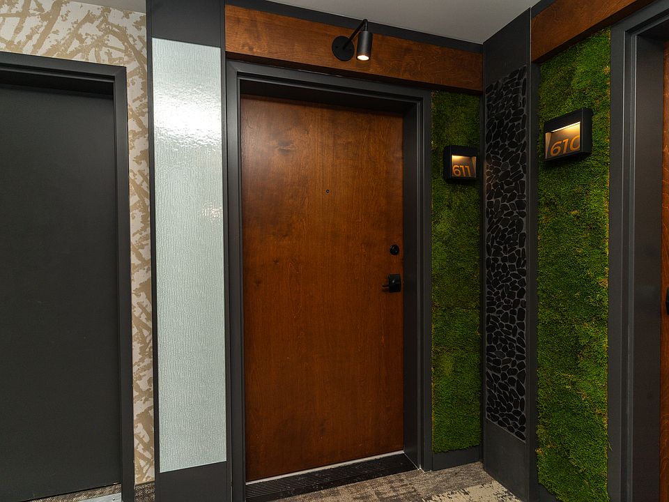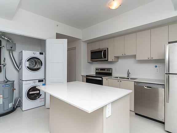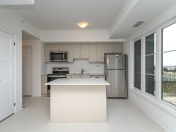 Bright Corner Condo with Top Floor - 4 Season Balcony! 901 sq. ft. open-concept 1+den with retractable glass-enclosed balcony (BBQs allowed!). Steps to GO, transit, and shopping. Nature trails at your door. Water filtration & air purification. Resort-style amenities: firepits, waterfalls, 2-storey lobby with live tree, jogging track & more! Laundry: Washer-dryer included Cooling: Central Heating: Forced air Appliances: Dishwasher, freezer, oven, refrigerator Flooring: Hardwood