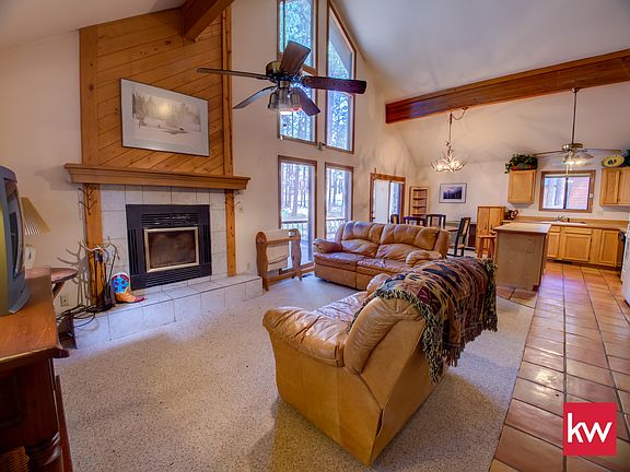 This affordable cabin in the woods is looking for the next homeowner to show it some love and turn it into a gem. Located on a level lot with easy access from the town center, this home is surrounded by trees, offering a private feel from back yard and deck. Inside you'll find a large great room with vaulted ceiling, floor to ceiling windows, a wood burning fireplace and a dining area that accesses the wrap around front deck. The kitchen has plenty of cabinets and an island with seating. Down the hall is a washer and dryer nook, 1 full bathroom and 2 guest bedrooms. The master bedroom is also on the main level with en-suite bath. Upstairs features a large sleeping loft / 4th bedroom with plenty of space for beds, an office or a second living area. Finally, the home has a 2 car garage and a paved circle driveway.