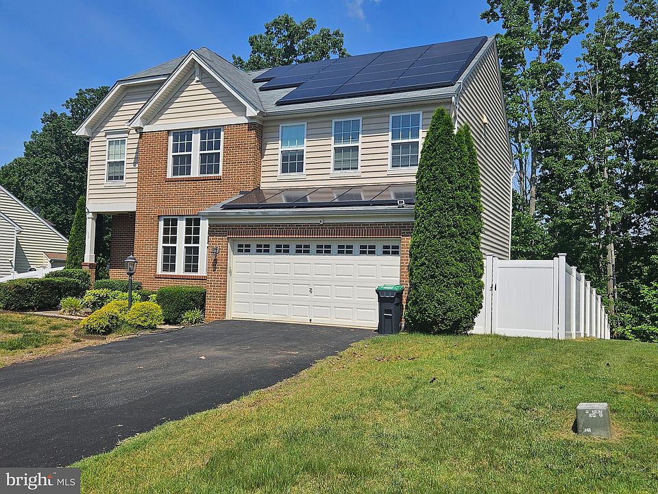 Free electricity from the maintenance free panels on the roof. 100% paid off and 20 years remaining on the warranty, plus power walls for whole home power during any storms or grid outages. Well maintained and freshly updated with new carpet, paint, deck trim, and new fence, this 4 bedroom, 3.5 bathroom brick and vinyl home is move in ready. House was built with additional 24" extension providing over 200 additional square feet on this Drees Ashley model. Fenced back yard backs to woods included in the lot square footage. The raised garden area has mint and strawberry plants already growing. The covered porch leads to an open foyer of oak hardwood floors. A carpeted formal room (alternate dining room/living space) with a wall of windows brings in the sunlight. Main area is fully open from the gas fireplace to the large kitchen space with stainless steel appliances and oak cabinets. Sliding glass doors in the main area lead to a large deck with stairs down to the back yard. Large pantry, and powder room lead to the family foyer/garage entrance. Two car garage with finished (unpainted walls), and lots of shelfs for storage, including 240V electric vehicle charging plug. Upstairs is the upgraded owner’s suite with sitting area, tiled bath with jetted tub, and separate shower. Large walk in closet in the primary bedroom and walk in closets in each of the other 3 bedrooms provide lots of space for wardrobe. Convenient large laundry room with washer and dryer, and full guest bathroom providing everything the upper level could need. Home has a large basement which is mostly finished plus an unfinished storage room. The basement has walkout sliding glass doors to a patio. Pre wired home theater surround with projector and screen installed and connected AV receiver that conveys. Home gym/workout area with added full bath, plus a bar area with wet bar rough in make this space flexible and usable as living space. Quiet neighborhood with easy access to route 1, I-95, Quantico Marine base, Stafford shopping and restaurants, plus several other nearby amenities like the Potomac point winery, and Patawomeck and Widewater parks a short drive away. No HOA on this road in the Stonebridge at Widewater section of Stafford VA. Bring your best offer and take this awesome property off the market. House is vacant and can show anytime day or night.