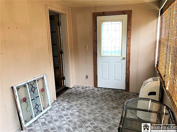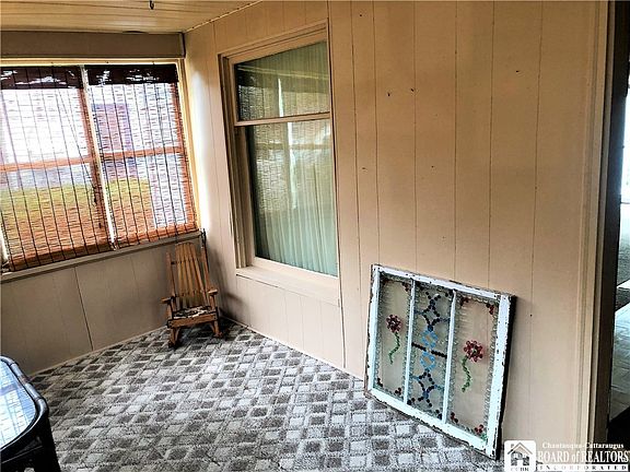 3 bedroom, 1.5 bath home located on a quiet st. in the Village of Celeron. 1 min. drive down to Chautauqua Lake Lucille Ball Memorial Park & boat/kayak launches. Located out of the City but close to all the amenities. New vinyl sliding glass doors lead out to the back deck & fully fenced in yard with 24'x4' above ground pool(winterized, ready to open)2 sheds, out door fireplace, decorative/flowering trees, shrubs & flowers. New metal roof(less then 10yrs) Inside the home features: Enclosed front porch/sunroom, roomy living room(w/ electric fireplace)/ dining room open flow "L" Shape, modern interlocking carpet throughout, kitchen w/ rich stained wood, newer waterproof interlocked wood grain flooring, modern appliances, new garbage disposal & island(moveable) for more storage & counter space. Den has custom made shelving, built in cedar steam sauna that leads into 1st flr laundry area w/ 2 cabinets for storage, water/electric hookups & 1/2 bath. Upstairs includes 1 large bedroom plus 2 smaller bedrooms, full bath w/shower/tub combo, toilet & sink are new.(3yrs) along with new waterproof interlocked wood grain flooring. Home has been the same owner for 20 yrs and is priced to sell.