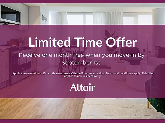 Altair offers spacious studio, one, two, and three-bedroom thoughtfully designed and upgraded suites with all your needs in mind. With spacious layouts and full-sized appliances, we are certain you will find the perfect suite to suit your needs.Offering a variety of amenities including a seasonal pool, party room, laundry facilities, playground, and plenty of parking. Altair has what you need. With attentive 24-hour security, on-site management, and a friendly sense of community, we want you to call Altair home.