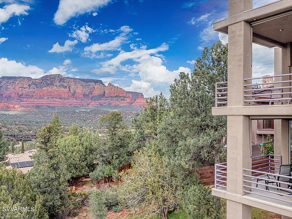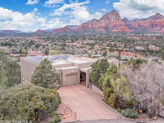 If it's spectacular panoramic views you want, then look no further than this 4600+ sq ft West Sedona custom contemporary home, artfully designed by Sheri Mleynek, and complete with a large 3 car garage. Welcome to 15 Mingus Mountain Rd - a rare find- a home with only one previous owner, which has never been smoked in, and has never had any pets As you enter through the beautiful stained glass double doors, you'll immediately take in the breath-taking views to the North: Brins Mesa, Coffee Pot Rock, Thunder Mountain. You'll enter the large primary suite – a private sanctuary with those GORGEOUS views! Take note of the approx. 200 sf private office with built in storage space and large windows facing these extraordinary views. Who wouldn't want to work from home? The main bedroom area has custom built in cabinetry to keep things out of sight and a private balcony deck whereyou can relax while taking in the beauty of Sedona's Red Rocks. Venture through the bedroom to the primary bath complete with two separate vanity sinks with waterfall faucets and Corian countertops, large stall shower and jetted, whirlpool Jacuzzi brand tub. The primary bath also has 2 large walk-in closets each with approximately 89 sf of space including custom shelving and drawers. In addition, this area also hosts a designated gym area with floor to ceiling mirrored walls. One floor down you will enter the living room with a designated book loft accessed by a spiral staircase. Dining room and media area lead into the large kitchen with granite countertops, a dual wall oven for those avid cooks, gas cooktop and open dine in area that leads to another balcony deck to enjoy all day and nighttime views. The kitchen has a very substantial walk-in pantry with floor to ceiling shelving. Also on the lower level are 3 bedrooms, a full bathroom, guest powder room and a large laundry room with built ins and convenient utility sink. Two of the three bedrooms lead out to a private deck with panoramic, sweeping red rock views, perfect for taking in those famous Sedona sunsets! If it's storage you need, you've come to the right home! The lower level also boasts 2 linen closets and a roomy under staircase closet for all that extra 'stuff'. But wait... there's more! One more level down you'll discover a large, bonus room which has previously been used as a photography studio. The possibilities of what this space could become are endless! Your own private theatre screening room? Recreation room? Or completely redesign the space to accommodate an additional private living space with multiple bedrooms, perhaps? Stair lift conveys for easy access to second floor. Last but not least, you will enjoy the energy savings afforded by the solar panels which come with the home. No lease to worry about. These are paid for in full and convey with the property.