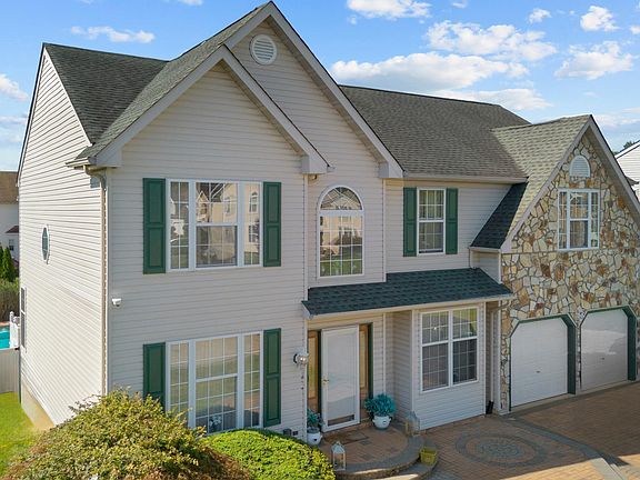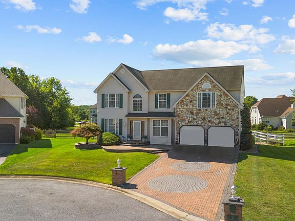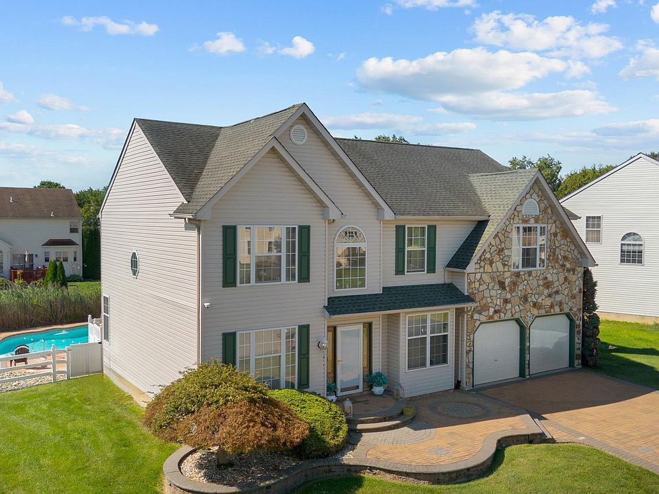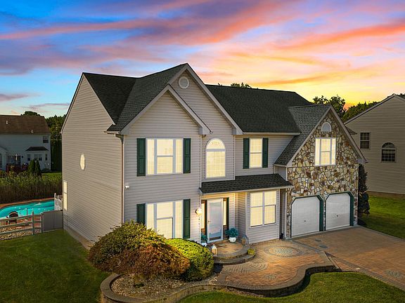 Welcome to 15 Moonlight Court in the popular Norwegian Woods tucked away on a quiet cul-de-sac! This beautiful 4 bedroom, 2 and 2 half bath home showcases exceptional curb appeal and impressive craftsmanship throughout. The exterior pulls you in with the custom brick driveway, extensive hardscaping, and a beautiful stone façade on the two-car garage. The backyard is fully enclosed by a white vinyl fence and features a spacious Trex deck with vinyl hand-railing, perfect for outdoor entertaining. Speaking of entertaining, this home has an impressive Sylvan in-ground heated pool with cascading steps into the shallow end, a built-in seat in the deep end, and encircled by a large paver patio. There is a pool equipment shed, and a grand built-in outdoor fireplace to complete this private backyard oasis. Inside, an inviting two-story foyer opens to a bright, open-concept layout that includes a formal living room, dining room, private office with french doors, and a step-down family room featuring a floor-to-ceiling stone gas fireplace framed by large windows. The eat-in kitchen showcases granite countertops, tile flooring, a stylish backsplash, a large pantry, and a built-in dining area, all connected by a stone walkway that adds to the architectural charm. Upstairs, the primary suite is a true retreat with cathedral ceilings, two large walk-in closets, and a luxurious bathroom offering a dual sink vanity, a stand-up shower, and a whirlpool soaking tub. The second floor hallway features hardwood flooring, and there are three additional bedrooms, a second full bathroom, plus a convenient laundry room. The finished basement is designed for entertainment, complete with a theater room with plush reclining chairs, a projector and large screen, a bar area, half bath, and ample storage. Additional updates include OWNED solar panels, a new tankless water heater (3 years ago), and the HVAC system and roof were replaced before the seller purchased in 2018. This home is convenient to all shopping, gas, grocery stores, major roadways, restaurants, and so much more! Schedule your tour today and move in just in time for the upcoming Holidays!