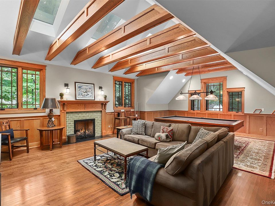 - Beamed Ceilings, Built-in Features, Cathedral Ceiling(s), Chandelier, Chefs Kitchen, Eat-in Kitchen, Entertainment Cabinets, Entrance Foyer, Exhaust Fan, First Floor Bedroom, First Floor Full Bath, Formal Dining, High Ceilings, High Speed Internet, Kitchen Island, Natural Woodwork, Open Floorplan, Open Kitchen, Primary Bathroom, Recessed Lighting, Stone Counters