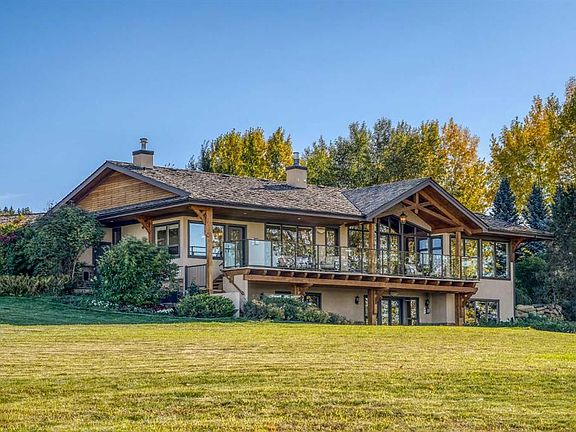 Introducing the Iconic Mountain View Estate - a landmark residence perched high in a premier Springbank location, embodying the very essence of elevated country living. Positioned gracefully on two pristine acres, this mountain-inspired walkout bungalow commands sweeping, unobstructed vistas of the Rocky Mountains, rolling foothills, and ever-changing prairie skies. From tranquil dawns to fiery alpine sunsets and dramatic summer lightning displays, every moment is framed by nature’s grandeur. Blending timeless architecture with authentic natural materials, the home radiates warmth and sophistication. Timber beams, cathedral-style vaulted ceilings, stone, slate, and wide-plank hardwood reflect the surrounding landscape, while wrought-iron details and artistic accents bring character and craftsmanship to every space. Each room is intentionally designed so that every window becomes a picture frame of the mountains set beyond. At the heart of the home, the Great Room creates a lasting impression. Towering timber frames, soaring ceilings, and a dramatic full-height stone fireplace create an atmosphere both grand and inviting. French doors lead to a spacious upper terrace where endless foothill and mountain panoramas inspire gatherings and quiet reflection alike. The chef’s kitchen is equally striking, anchored by a generous island with a curved eating counter, appointed with rich, custom Alder cabinetry, granite counters, and a professional six-burner gas range beneath a hand-crafted copper hood. Designed for both function and beauty, it flows seamlessly into the dining room, which opens onto a private courtyard. Here, an outdoor pergola dining area and lounge centered on a stone-clad fireplace provide an idyllic setting for morning coffee or intimate evening entertaining under the stars. The main level also offers a light-filled private office with French doors, a serene primary suite with spa-inspired finishes, and a well-appointed mudroom and laundry with ample storage. On the walkout lower level, expansive windows and radiant in-floor heating extend the lifestyle year-round. A spacious family/TV room, a custom-built wet bar and games area create space for both relaxation and entertainment. Three additional bedrooms, including one designed as a dual office and gym, are complemented by two full bathrooms. The estate’s grounds are equally considered. A circular front driveway, lined with mature trees and landscaped gardens, creates a true sense of arrival. Multiple outdoor living areas encourage year-round enjoyment, while car enthusiasts and hobbyists will appreciate four oversized heated garage spaces - attached and detached - seamlessly integrated with the architectural design. The Iconic Mountain View Estate is far more than a residence - it is a statement of style and sanctuary. A perfect harmony of mountain-inspired architecture, breathtaking natural beauty, and refined country living - it offers privacy, luxury, and inspiration every day.