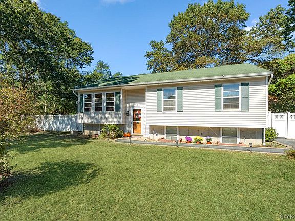 Welcome home to this beautifully maintained 4-bedroom, 3-bath Hi-Ranch, perfectly situated on over an acre at the end of a quiet dead-end street. Built in 1998 and owned by the same family since, pride of ownership shows throughout. Step inside to find vaulted ceilings, natural hardwood floors, and tons of natural light. The kitchen offers stainless steel appliances and flows seamlessly into the open living and dining areas — ideal for entertaining. The primary suite features a private full bath, while the finished lower level with an outside entrance provides plenty of flexibility for guests, extended family, or a home office. Enjoy a fully fenced yard with room to relax, play, or expand. Conveniently located near major shopping, public transportation, and just a short drive to the Southern State Parkway, Sunrise Highway, and Bay Shore Mall. A rare find with space, location, and long-term care — this one checks every box.