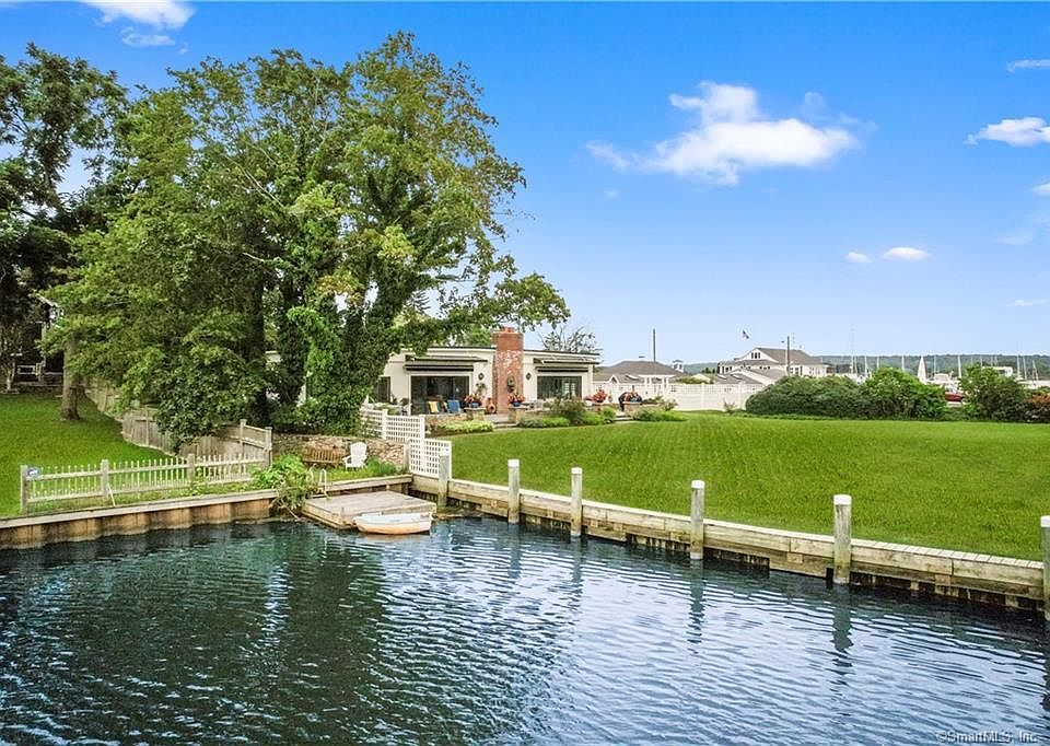 Essex Village Waterfront! This is a rare opportunity to have 190ft of direct waterfront in Essex Village. Nestled quietly on Middle Cove, adjacent to Essex Yacht Club, this Mid-Century Modern three bedroom home on 3/4 of an acre has its own dock with water and electricity. The channel leads you to the CT River in minutes. Meticulously maintained, the home enjoys sunrises to spectacular sunsets. The bluestone patio stretches the length of the house with long open views with beautiful lawn and gardens. The sun filled newly renovated kitchen has a stainless farm sink and faucet, built-in cabinets, polished quartz countertops, and a carved wood fireplace. The sit-down counter looks over a cozy dining area and glass sliders leading out to the patio and gardens. The living room, also with a fireplace, has a wet bar with a Mahogany bar top, a wall of windows and glass sliders lead out to the patio. Some of many recent renovations include the master bath's fabulous tiled walk-in shower with Rhol polished nickel fixtures, custom cabinets and Carrara marble dual sink counter with a chandelier over the tub. There are two out buildings; a barn for nautical and maintenance equipment, the other a finished heated studio. This private, unique one floor living home is only a few minutes’ walk to the famed Griswold Inn, the Connecticut River Museum, restaurants, and shopping. Half way between New York and Boston it is an ideal year round home or as a retreat.