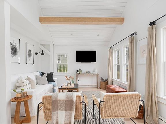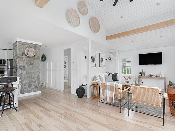 Welcome to your storybook escape—where charm, craftsmanship, and comfort come together just minutes from the beach. A curved gravel driveway with cobblestones repurposed from the 1800s, sets the tone for wonderful curb appeal. Step inside to soaring shiplap cathedral ceilings and an airy, sun-filled open floor plan that instantly feels like home. The beautifully designed kitchen is the heart of it all, featuring a fireclay farmhouse sink, floor-to-ceiling subway tile, open maple shelving, high-end cabinetry, sleek hardware, and all-new appliances—offering both style and function for modern living. The first-floor primary bedroom with adjacent full bath provides convenience, while two additional bedrooms and a half bath upstairs offer flexible space for guests or family. Immaculate hardwood floors and oversized windows flow throughout, creating a warm and inviting ambiance. Outside, enjoy a custom bluestone patio and a hand-built wood-fired pizza oven—perfect for al fresco dinners under the stars. A three-season glass sun porch and separate fire pit area extend your living space outdoors. Additional perks include a one-car garage, a storage shed, and a serene half-acre lot that feels like a private sanctuary. Featured in SO Rhode Island Magazine’s 2019 holiday edition, this special home blends timeless style with easy coastal living. Just unpack, unwind, and enjoy—your getaway awaits.